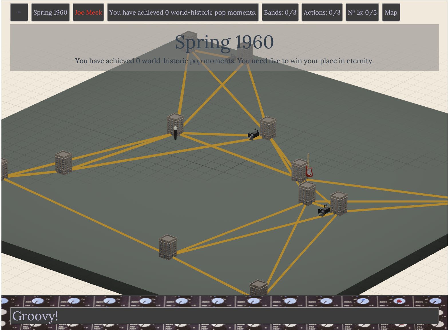 My initial concepts for the game, a band management simulator, were based entirely around the idea of shuffling bands between cities to record albums and play gigs, and so the main interface had ended up being this pseudo-world map with cities represented by Monopoly-esque tower blocks and routes between them drawn with rudimentary golden lines. Along the top you’ve got some important numbers: the season and year, which amount to the turn number, a count of how close you are to winning (‘historic moments’), how many bands you currently manage, how many actions you can make in each turn, and how many number ones you’ve had (five together get you a historic moment). Down at the bottom there’s space for buttons, which are the primary way you interact with the game (you can click the city models, for example, but there are also buttons for doing the same). As you and the AI players sign bands, they appear represented as little static people moving between cities.