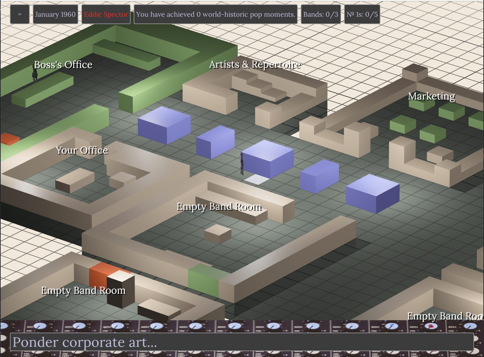 So: the drawing board. What I want, on a base level, is to maintain the gameplay of booking gigs and releasing records, but with the player feeling like they’re there, in the background of some documentary about the Beatles, pulling the strings. Put simply: seeing some tiny little people moving about would make this way more compelling – one of the best things about _space_train (my first and most sprawling gamedev effort) was the permanent cast of personality-driven little aliens scurrying about the train around you. But that means having the game take place somewhere – there has to be a building that both the band and you, the manager, are plausible in at the same time. I went for an odd combination of the label corporate office and recording studio for the moment, with a pin in the idea of how to represent gigs for later.