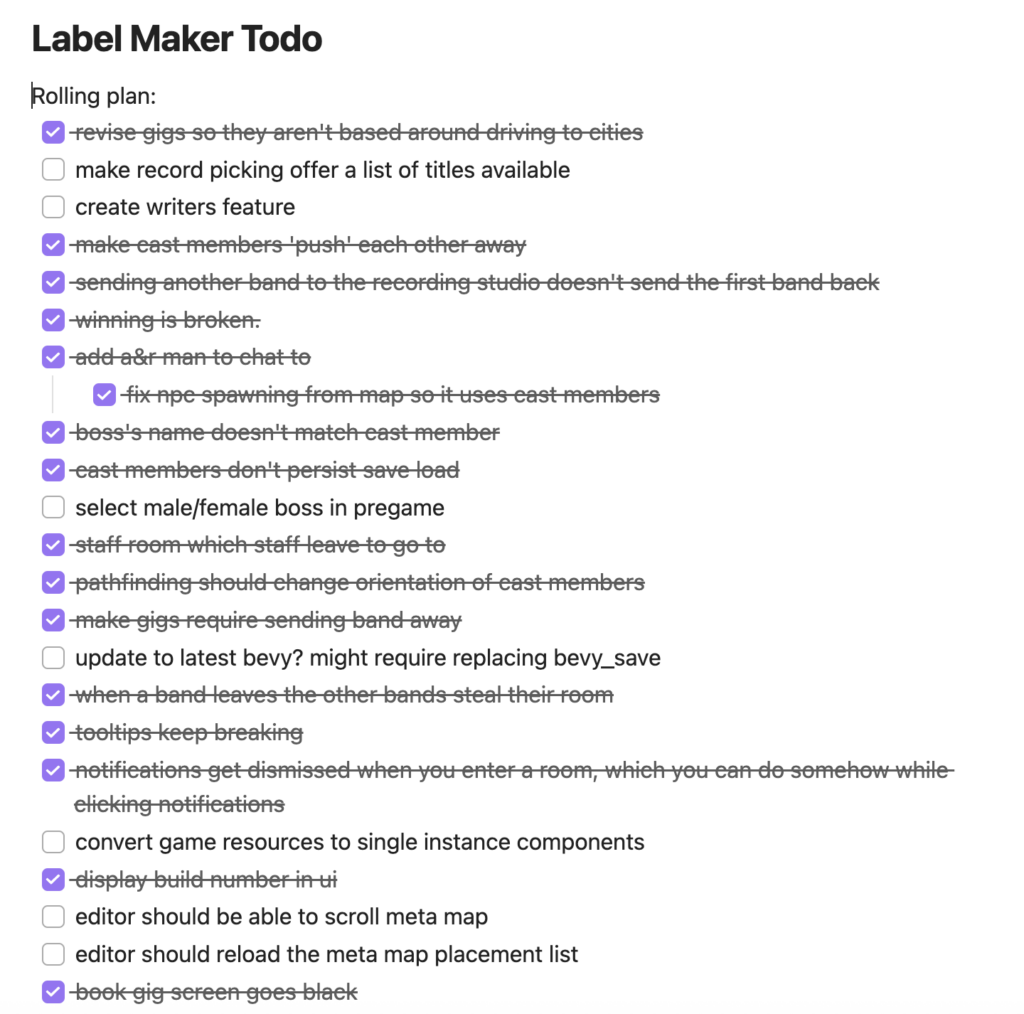 For example, in the last few weeks I have put multiple days work into two fairly trivial problems: one, having a band of four or five people walk to the elevator, disappear, then return, and two having a single person walk to the break room and back. The former required some way to know when a band was ‘off-stage’, so to speak, and the latter required being able to figure out where someone should go back to according to their role and the current state of the game. Neither was trivial to do!